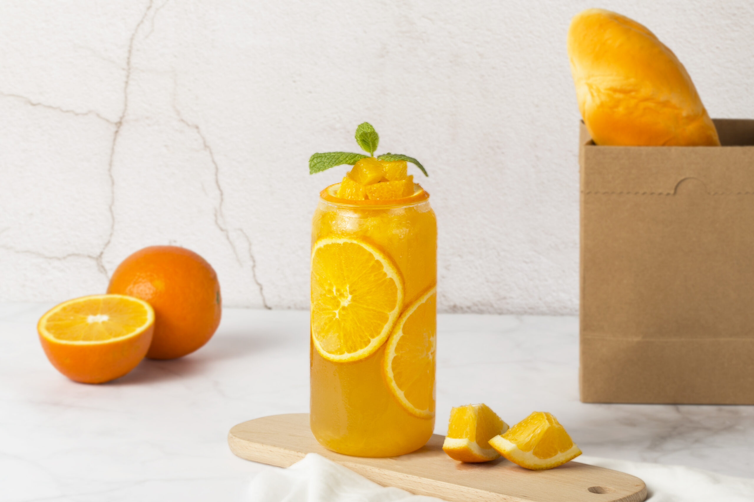 Tea soup: 250ml, orange:150g, fructose: 55g, ice cubes: 220g